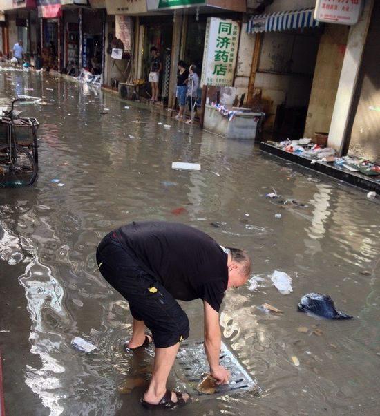 龙港网10月8日讯:今年第23号台风“菲特”突袭龙港,导致龙港镇不少道路积水严重,今天下午,记者在龙翔路沿河南路现场看到,虽然台风已过去一天的时间,但地面的积水仍非常明显,不少居民自发组织力量去排涝。一位附近居民告诉记者:“由于时间过久,管道已被淤泥堵塞,再加上此处属于一个坑洼地带,每逢暴雨,四处的积水都会往里流,导致管道淤堵,现在我们出门都困难,希望有关部门能够尽快完善排水系统。