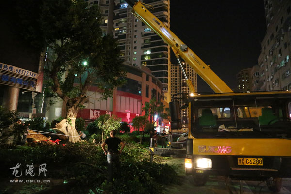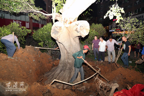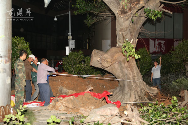龙港网10月10日简讯:强台风“菲特”掠过,位于龙港镇泰安路置信小广场的一棵大榕树被狂风吹倒,周边居民都盼着大榕树能起死回生。今天晚上6点,龙港镇生态服务中心调来吊机丶挖土机将大榕树吊起“扶正”重新培土种植。