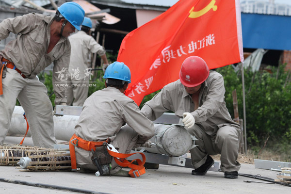 龙港网10月14日讯: 日前,在龙港镇环河村,一条2公里的道路旁,28基电线杆受台风影响,均存在不同程度的损伤。在现场,国网杭州市萧山区供电公司前来驰援的抗台抢险战士正忙碌的开展抢修工作。