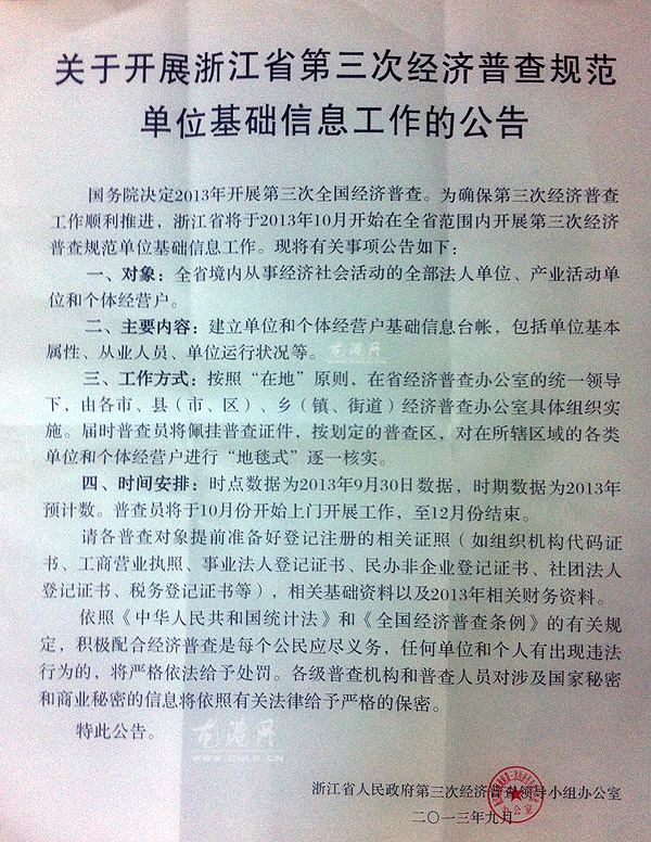 关于开展浙江省第三次经济普查规范单位基础信息工作的公告