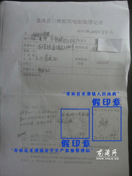 经核实,该生产经营单位业主违反苍南县关于三相电表报装的有关规定,未按规定程序进行审批,并私刻“苍南县龙港镇安全生产监督管理局”和“苍南县龙港镇人民政府”2枚公章,弄虚作假,违法获取安装三相电表资格,该案件现已移交公安机关进行处理。