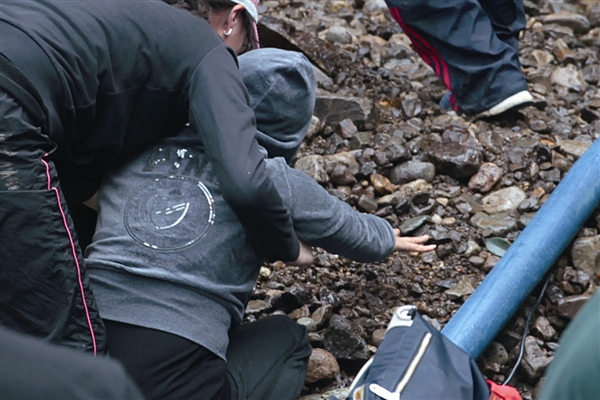 昨天下午,莒溪大峡谷梅花潭的水被抽干,小温的母亲情绪激动,徒手扒开砂石试图找到小温的其他线索。