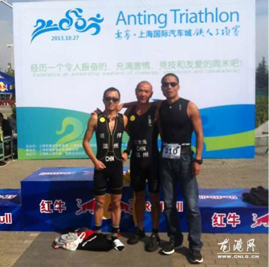上海国际铁人三项赛 龙港铁三协会江青海(中)获组别冠军