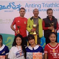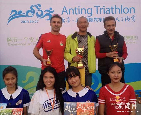 龙港网10月28日讯:(陈记)2013 秋季安亭·上海国际汽车城铁人三项赛27日在上海汽博公园举行,本次赛事由上海铁人三项俱乐部主办。旨在推广铁人三项运动,为各界业余铁人三项爱好者提供交流和竞技的平台。龙港镇铁人三项协会派出江青海、章途聪、谢伟等3人参赛。通过激烈的角逐,江青海获得40岁组别冠军,并获得本次大赛总排名第三,这也是中国人第一次站在安亭领奖台上。谢伟也获得男子30-39半程亚军。