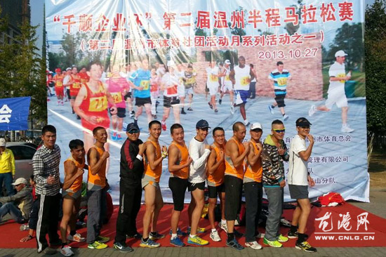 龙港网10月28日简讯:昨天,“千顺企业杯”第二届温州半程马拉松赛在市区瓯江路圆满结束,本次比赛开设21公里半程马拉松和4.2公里迷你马拉松两个项目,来自台州市、温州市共18支协会200多运动员,其中龙港镇铁人三项协会安道轩(美籍)和吕明化分别获得半程马拉松男子青年组第三名(:1小时21分51秒)、第九名成绩:1:35:09秒, 男子中年组第三名王细求1:24:37,第五名王瑞表1:26,第六名潘凯骋1:27。