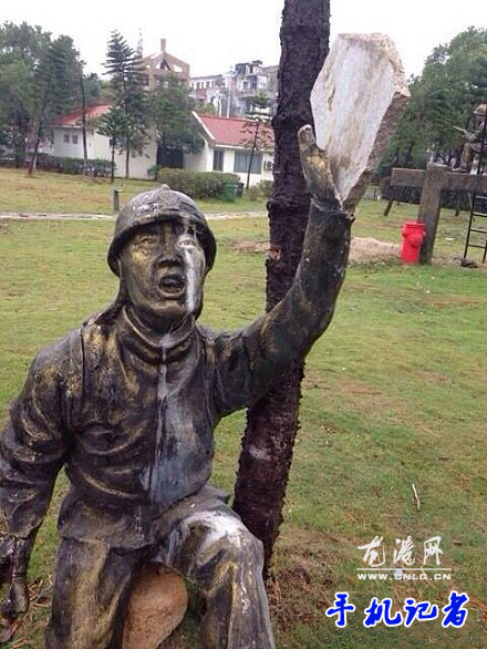 龙港网11月3日讯:(陈记)今天11点许,龙港一博友 @vip彼岸的蔚蓝 在新浪微博上发帖称:[爱护公物,人人有责] 龙港江滨公园外滩“消防从林”消防蜀黍的雕塑人为破坏严重。设立雕塑本意为宏扬正气,可敬!但破坏公物,强烈谴责,可耻!