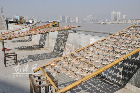在靠近下埠堤塘的路边两侧,一些宰杀后的乌贼、鳗鱼被摆上竹篱翻晒。近来天气忽晴忽阴,有的市民还动用风扇对剖好的鱼货进行风干。市民们说,这里靠下埠码头很近,每次渔船靠岸,都会带来大批海鲜,他们都会在上市前提前向渔民收购,买来的海鲜不仅便宜,还很新鲜,做成干货很合适。