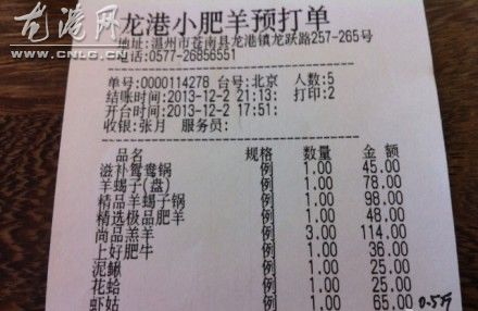 龙港网12月3日讯:有网友向本网反映:龙港小肥羊火锅店虾姑卖130元一巿斤合理吗?!平时用餐后,一直没注意结算单。昨晚,几个朋友在龙港小肥羊火锅店用餐,点菜时,菜单上虾姑标注:时价,我们点了半斤,共五只。用餐后,拿了结算单不轻意瞧了一下,发现虾姑价格65元半斤,也就是说小肥羊的虾姑售价是130元/斤,一只虾姑平均要13元。后来我们也打听了下其它酒店的虾姑售价,大部分都在一百元以下每斤。小肥羊这般霸王定价是否太坑人?!!