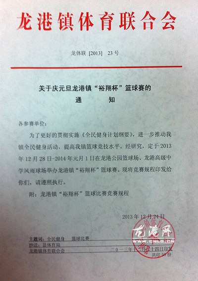 龙港网12月27日简讯:(编辑陈峰)今天,本网从龙港镇体育联合会获悉,为了更好的贯切实施《全民健身计划纲要》,进一步推动龙港镇全民健身运动,提高龙港镇篮球竞技水平,2013年12月28日-2014年元月1日在龙港公园篮球场和龙高球场举办龙港镇“裕翔杯”篮球赛。