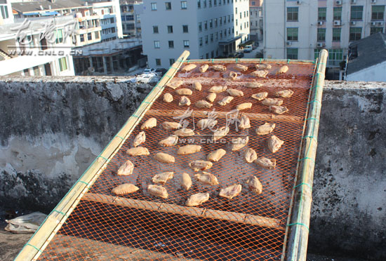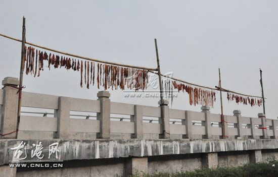 龙港网1月16日讯:天晴朗晒年货,街头年味渐浓。近日,连续的晴好天气,龙港居民纷纷将过年食用的自制腌酱制品如酱油肉、酱油鸡、鱼干、酱油鸡腿等年货拿出来晾晒,为过年做足准备。今天上午,记者在乡村街头,随处可见村民晾晒的一竹竿一竹竿色泽诱人的自制腌制品,香味飘香,让人逐渐感受到浓郁起来的年味。