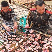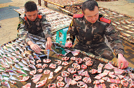 龙港网1月24日简讯:近日,武警温州支队舥艚边防派出所官兵们发扬部队勤俭节约的优良作风,自己动手晾晒鱼干,丰富菜篮子,节省部队伙食经费。 (周元斌/摄)