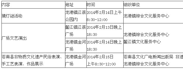 龙港网2月12日讯:2014年是全镇人民面对新挑战迈向新征程的一年。为鼓舞广大人民群众的新年干劲,同时也为更好地烘托节日气氛,大力弘扬民族民间传统文化,以特色鲜明、氛围浓厚、精彩热烈的文化活动丰富龙港镇人民群众的文化生活,突出“和谐、发展、亲民、喜庆”的主题,奏响实现龙港率先发展的主旋律,激发全镇人民团结奋进,使人民度过一个欢乐、喜庆、祥和的元宵佳节,现结合实际,举办文艺晚会、猜灯谜活动、非物质文化遗产的表演及展示。 活动内容详见如下: