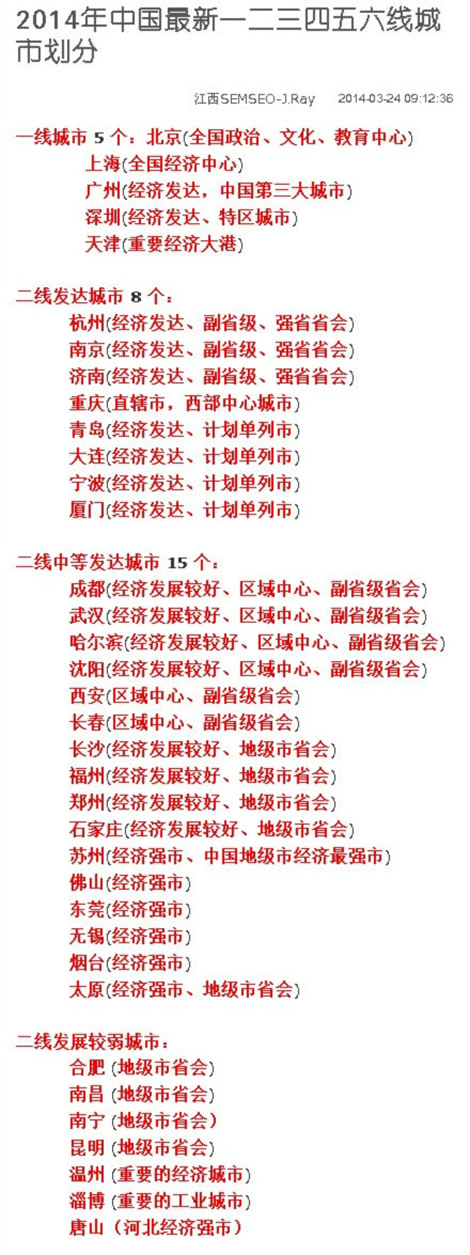 中国城市分级:对400个城市进行了一线品牌进入密度、一线品牌进入数量、GDP、人均收入、211高校、跨国500强进入数量、大公司重点战略城市排名、机场吞吐量、大公司进入数量、使领馆数量、国际航线数量共10项指标的单项排名。