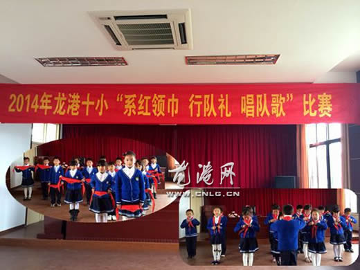 龙港网4月15日讯:近日,龙港十小开展全校性的“系红领巾、行队礼、唱队歌”的比赛活动。同学们严格遵从学校的安排,听从指令。在系红领巾时,按照“领巾折折好,戴在衣领 下,左尖压右尖,右尖绕一圈,圈里抽右尖,衣领翻翻好”的原则,做到快速而又规范。行队礼时,学生们都立正站好,敬礼姿势准确。礼毕后,同学们用最饱满自 信的精神状态唱着少先队队歌,用整齐统一的歌声来展现少先队队员积极上进的精神面貌。