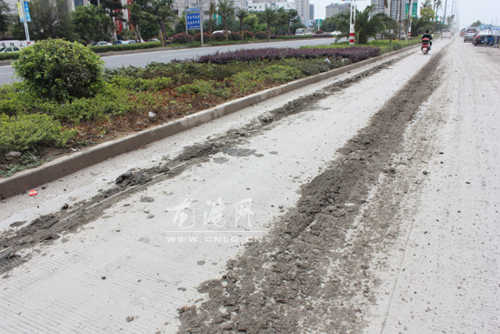 龙港网4月24日讯:昨日上午,本网24小时新闻热线68099777接到投诉称:在龙港龙金大道非机动车道上,有大量工程运输车经过并不断掉落石块,很是脏乱。随即,本网记者赶到现场了解情况。