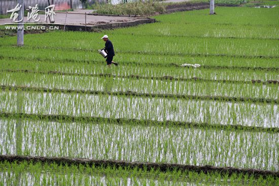 稻田中,只见农民左手提着装有尿素的塑料桶,右手抓着尿素一把把均匀地撒在水稻间,一幅繁忙的景象,据沈大伯说,这些水稻是5月初插下去的,经过近半个多月的生长,现已郁郁葱葱长势良好。“趁今天天气转晴,我们马上抓紧田间管理,这次肥料施下去,水稻的生长速度会更快,分蘖更多,为丰收打下基础。”