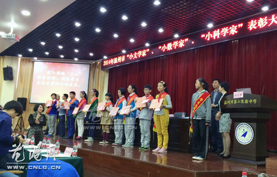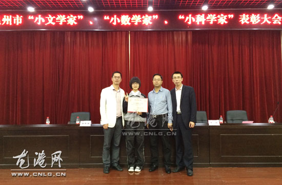 龙港网5月19日讯:日前,2014年温州市“小文学家”“小数学家”“小科学家”表彰大会在温州市第二实验中学隆重举行,90位学生受到表彰。其中,来自苍南县文汇中学(原为温州市实验中学龙港校区)的胡婷婷同学,荣获了2014年温州市第五届“小数学家”称号。这是温州市“小数学家”评选五届以来,苍南县首位初中学生获此殊荣。该校校长、指导师应邀参加这次表彰大会。