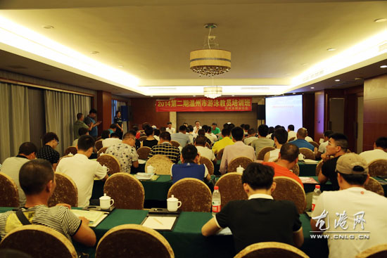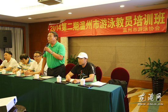 龙港网-体育频道6月5日讯:(本网编辑徐登威 彭立剑) 由温州市游泳协会主办的2O14年笫二期游泳教员培训班今天在龙港开班,来自全市各县区80余名游泳爱好者参加为期3天,初丶中级游泳教员培训。苍南县体育局副局长章树学,温州市游泳协会主席蔡卓名明,副主席陈承耀,温州市体育运动学校高级教练刘连云,龙港冬泳协会副主席陈国栋出席开班仪式。