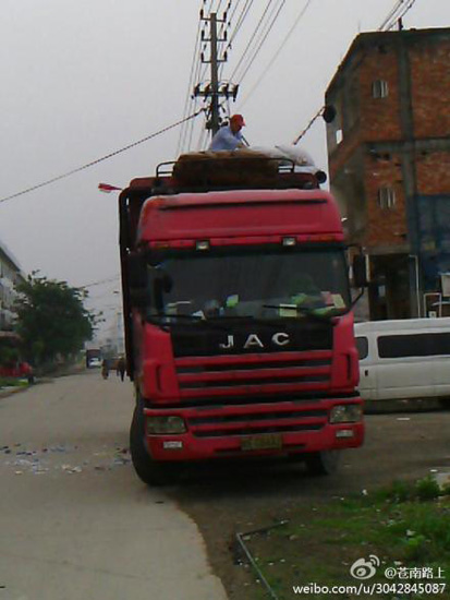 龙港网6月5日讯:龙港一博友 @苍南路上 在新浪微博发贴称:“ 最近一些货车经常在位于龙港镇海城社区海下村的龙舥公路边卸货,堆积如山的货物时常触及路边的通讯光缆,头顶上的高压电线也是触手可及,看到实在让人提心吊胆。”