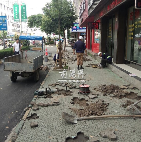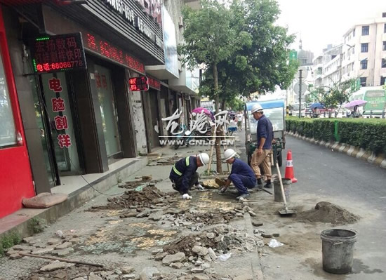 龙港网7月18日讯:今天早上,当你走在龙港镇人民路上,就会发现往日车闹人杂的人民路两边人行道上,工人们冒着酷暑正紧张有序的施工,对人行道上破损的路面进行修补。