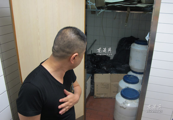 昨天下午3点许,记者随龙港食品药品监督管理所执法检查人员来到该店时,该店正在营业。该店负责人金先生接受执法人员询问时说,网友所发照片里的桶,里面装的是店里的废油,由环保能源公司不定期回收。记者注意到,金先生所指放废油的房间与厕所相邻,门上注有“员工专用”字样,里面放有4个塑料桶,其中2个已装有液体。金先生解释,桶内液体就是店里的废油。