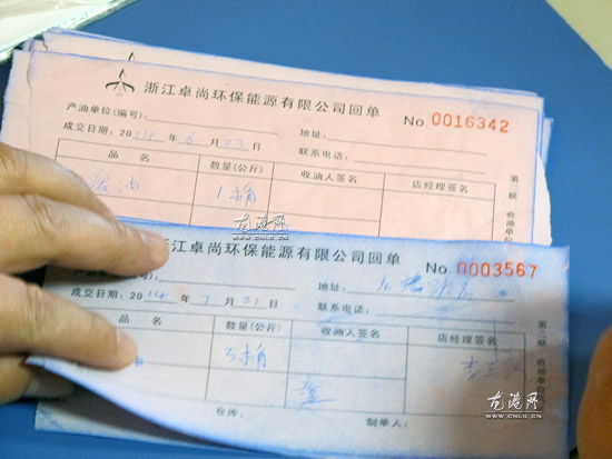 金先生说,微博图片拍摄时间应为7月21日,当天曾有能源公司员工上门回收废油,并将油桶从“员工专工”房间移到门口。金先生向执法人员出示的浙江某能源公司温州公司的一叠回单显示,7月21日,浙江某能源公司温州公司在该店回收了三桶废油。本月3日、12日,该公司也曾在该店收过废油。