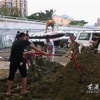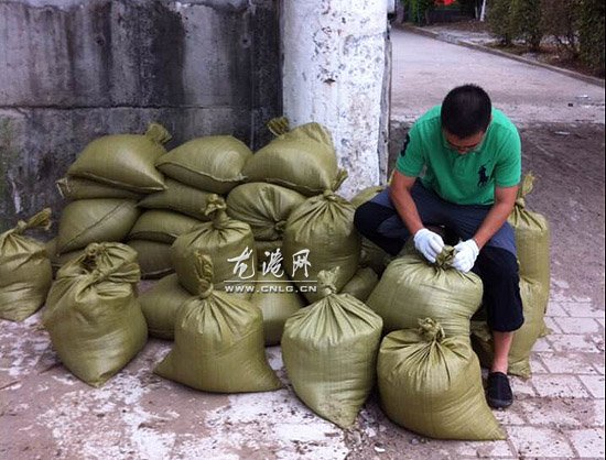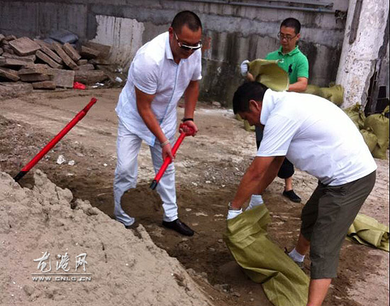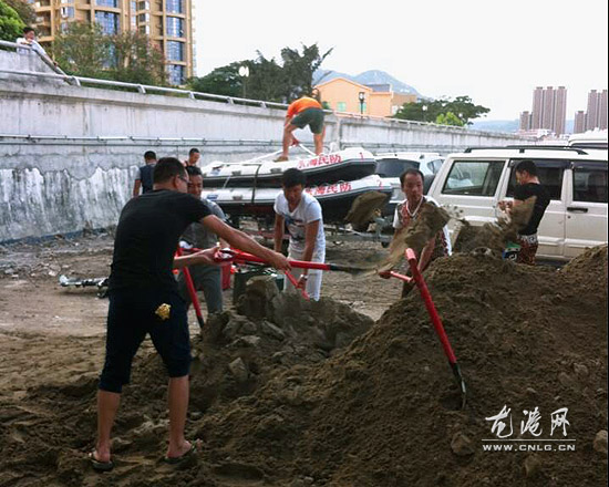 图为东海民防救援中心机动大队队员正在装运沙袋