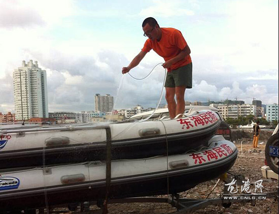图为东海民防救援中心机动大队队员正在整理快艇