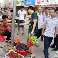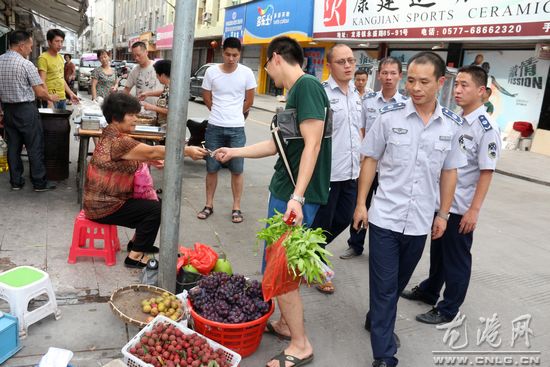 现场,记者看到路边摆满了各种各样的流动摊贩,有卖蔬菜的,也有卖海鲜和水果的,可谓应有尽有。一些流动摊贩在路边随意搭建了棚架,一些流动摊贩则直接把海鲜或蔬菜摆在地面上,一条原本就不宽敞的道路被堵得“水泄不通”。随后,执法人员迅速分成多支小分队,开始沿着马路菜市场进行整治。在整治过程中,执法人员以劝导为主,对人行道上蔬菜、海鲜类批发摊点的经营秩序进行规范,并责令摊主下次不得在街上随处摆摊,一旦发现马上取缔。