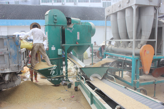 在殿后粮库,记者见到了新河村种粮大户黄星都,他正等待工人将自己一车车的稻谷放上粮机输送带。在老黄送粮车后,还有5、6辆拖拉机装满了稻谷,10多位农民等候粮库收购他们送来的稻谷。