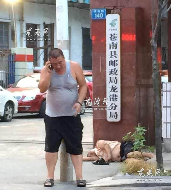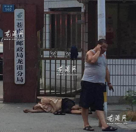 龙港网8月5日讯:(陈记)今天下午,龙港镇一网友“侦察兵”发来照片称:“龙港邮政局门口一男汉子躺地上,而且地下还很烫,大家都在纷纷议论酒喝醉成这样。