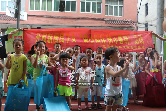 活动结束之际,龙港镇新居民服务管理局工作人员给新居民小朋友们带来了一份开学礼物,小朋友们高举礼盒乐开了花。(应吟吟 李素华/文)