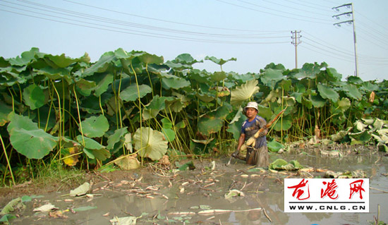龙港网讯:江西上饶市农民刘胜权在龙港大岩、水深垟村种养莲藕已达10年。目前40亩的莲藕已开挖十几天,预计亩产可达2000公斤左右。(章定志/摄)