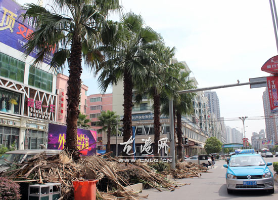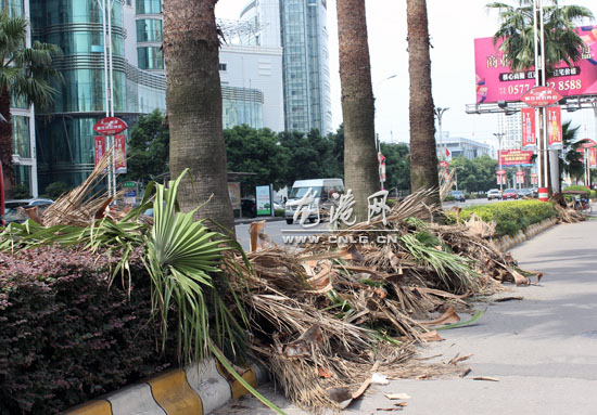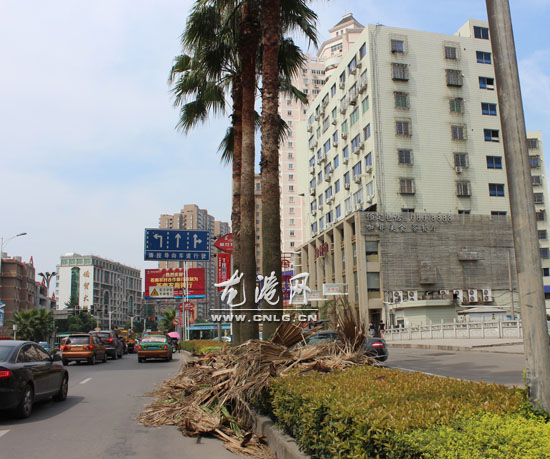 在龙港大道的两旁绿化带上,种植了不少棕榈树,主要起到美化环境、净化空气的作用。但是,棕榈树的枯黄枝叶通常又长又大,垂挂下来既阻挡视线又容易与过往车辆擦碰,不仅容易刮蹭车辆,而且还会自行掉落下来砸到路旁行人,造成不必要的损失。