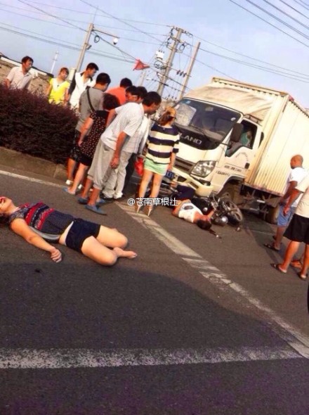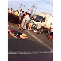 龙港网9月3日讯:据网友爆料,今早,龙金大道钱库往龙港方向广店路口处,一辆货车把骑摩托的撞了,车上一男一女倒地,女的动也不动,男的头皮刮了一片在车下,挣扎中。两人都流了超多血,希望没事,也望广大司机开车一定要控制好车速。