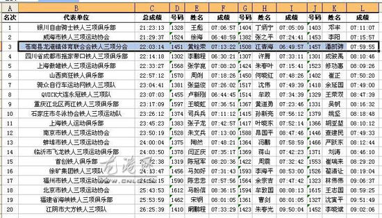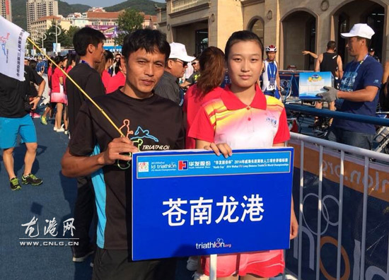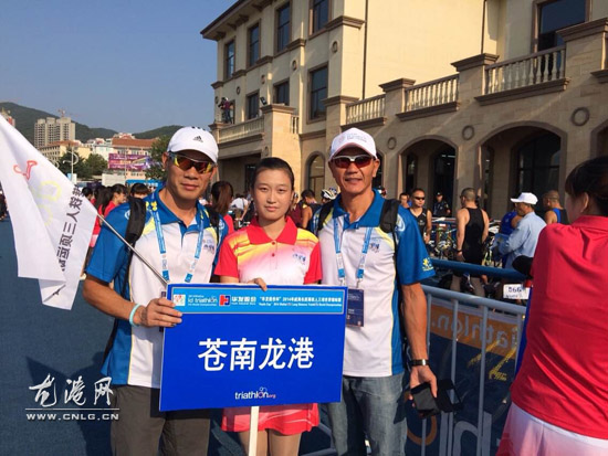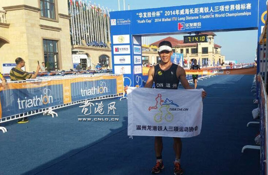龙港网-体育频道10月7日讯 (陈记 陈国栋) 日前,2014年威海长距离铁人三项世界锦标赛将在威海市半月湾铁人三项专用赛场举办。其中举办全国冠军杯赛、全国业余积分赛、长距离铁人三项世界锦标赛。龙港镇铁人三项协会派出10名队员参赛,通过大家共同紧张激烈角逐,江青海成绩:06:49:57,黄铨荣成绩07:13:22,潘凯驰成绩07:59:55。最后,总成绩为22:03:14获得2014年威海长距离铁人三项世界锦标赛男子长距离组团体总体第三名的优异成绩。