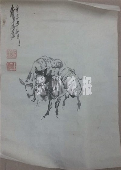 公开资料显示,黄胄(1925—1974)是中国画艺术大师,社会活动家和收藏家,擅长人物画和动物画,尤以画人物和驴著称。根据警方提供的照片,记者看到,陈某收藏的这幅黄胄字画,画的是两匹驴,其中一匹驴驮着重物。左上角落款:甲子年秋月,黄胄于两石居。