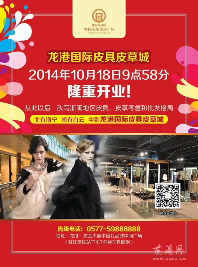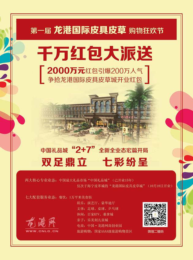 2014年10月18日9点58分,“龙港国际皮具皮草城”开业暨“第十届龙港集体婚礼节”仪式将在新落成的中国礼品城中心景观广场举行,届时,由海宁皮革城商家群体为主的时尚皮具和皮草店铺将闪亮启幕,标志着在经过3年时间铺垫准备之后,中国礼品城全面改造和转型升级迎来首战告捷,“2+7”新商业业态揭晓。(“2”指礼品批发零售和皮具批发零售两大核心专业业态,“7”指餐饮、娱乐、文体、休闲、亲子、电商和旅游购物7个配套服务业态)。