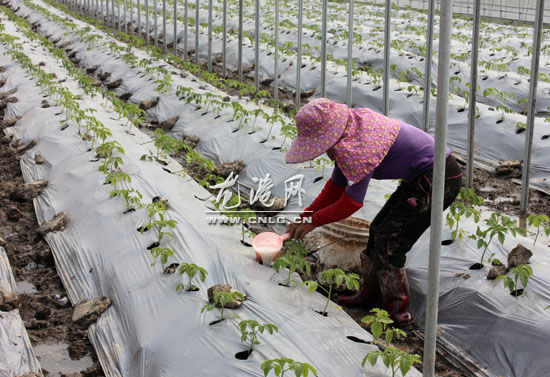 大棚番茄移种不久 农户施肥忙