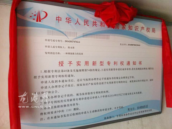 龙港网11月4日讯:日前,由龙港环河村村民陈永胜发明研制的“增强推力的新型装置”获得国家专利。该装置采用驱动装置,驱动传动带运转产生推理的基础,增强输出推力。采用不同长度的顶杆产生不同的推力。这个装置投入后,能极大将耗能降低,有着广阔的推广前景。