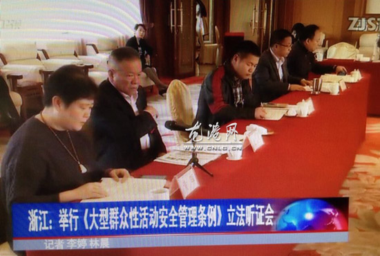 龙港网11月14日讯 (陈记)“ 建议增加条款:严重违反社会生活噪声污染防治,严重制造噪声干扰他人正常生活的; 发售票证的比例是多少?应该要明确,建议增加:门票不得超过安全工作规范规定的80%,工作人员证件发放不超过20%。《办法》还不够细化,各部门的职责应该更明确些。”“能不能简化大型活动的审批程序?”…… 昨天上午,浙江省人民政府法制办公室和浙江省公安厅在杭州之江饭店举行《浙江省实施〈大型群众性活动安全管理条例〉办法(征求意见稿)》立法听证会,10名来自各行各业的听证代表各抒己见,龙港网负责人陈振旭、杭州机床集团退休干部崔盐生、杭州飞越文化传播公司总经理黄晖等等作为立法听证陈述人为大型群众性活动的安全管理献计献策。省政府法制办副主任杨必明,省公安厅治安总队长朱思恩,省公安厅法制总队长张晓峰,省公安厅特警管理处处长朱振国,省政府法制办立法二处处长童剑锋等领导参加。