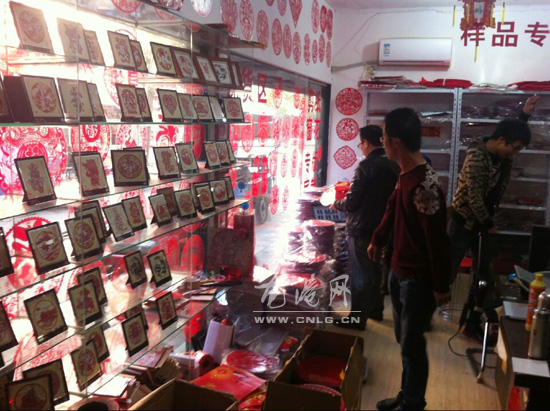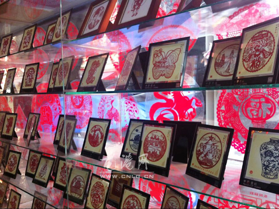 在礼品城四区的这家窗花剪纸店,一件件用镜框装饰的剪纸作品被摆上显眼位置。火红的剪纸在框内白底的映衬下精美不失素雅。工作人员介绍说,这种“镜框剪纸”是今年刚开发的,现在可是店里剪纸的“高富帅”。