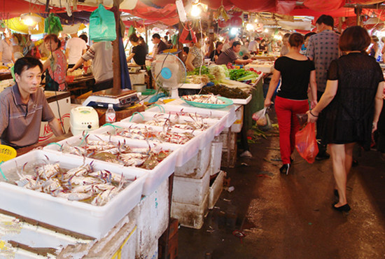 回望两年多前,同样的地点,却是不同的景象:夹在水产与鲜肉摊位之间的过道总是湿滑、泥泞的,市场内的灯光也是昏暗的,而热闹早市留下的菜叶菜皮随处可见。