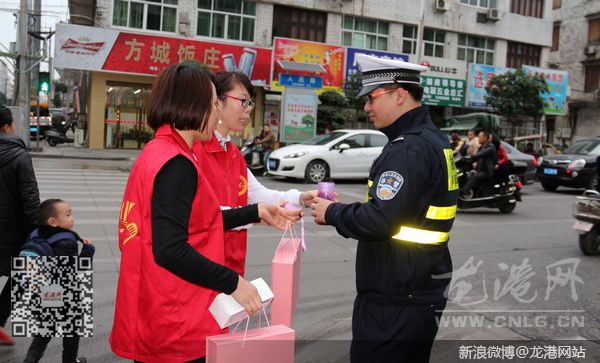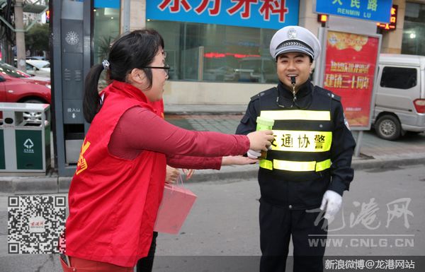 龙港网12月16日讯:连日来,气温骤降,寒风肆虐,广大交巡警仍坚持在凛冽的寒风中,为大家的出行提供方便。昨天下午,苍南弘毅社会工作服务中心组织志愿者到龙港各个路口亲切看望慰问坚守在一线工作岗位上的交警,为他们送去了姜汤、生活用品等物品。