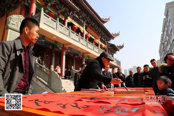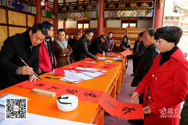 2月7日,在双排殿前,20余名书法家现场挥毫泼墨创作春联,书桌前挤满了前来求春联的村民,没多久,一副副承载着美好祝福的春联就在书法家的妙笔下诞生了。 “拿回家过年的时候贴,这和买来的意义不一样,更有年味”一位东排村民陈某在相中一副春联后说。