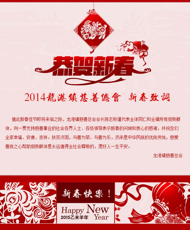 [导读]值此新春佳节即将来临之际,龙港镇慈善总会会长陈志秋谨代表全体同仁和全镇所有弱势群体,向一贯支持慈善事业的社会各界人士、各级领导表示新春的问候和衷心的感谢,并祝您们全家幸福、安康、吉祥。