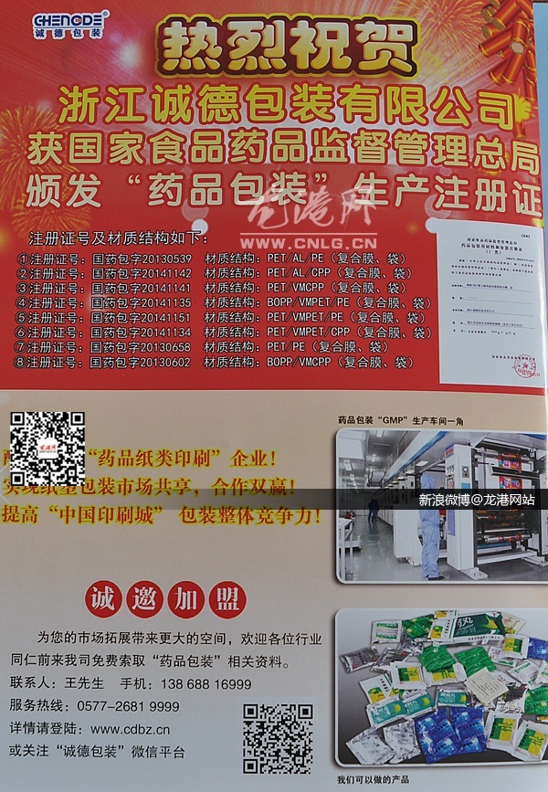 时值岁末,浙江诚德包装有限公司迎来一件大喜事。企业喜获国家食品药品监督管理总局颁发的“药品包装”生产注册证,这八张涵盖了各类复合膜、复合袋材质结构的证书,是企业长期追求技术和创新的结果。这对于配套服务“药品纸类印刷”企业、实现纸塑包装市场共享和提高龙港“中国印刷城”包装整体竞争力具有重要意义。也是温州地区国家食品药品监督管理总局颁发的“药品包装”生产注册证最齐全的生产企业。