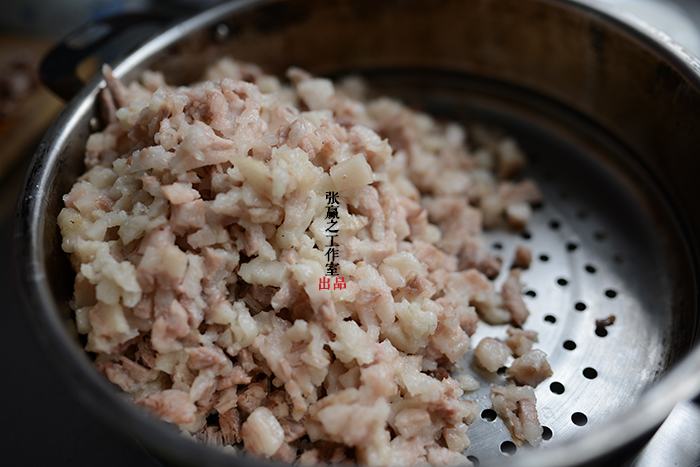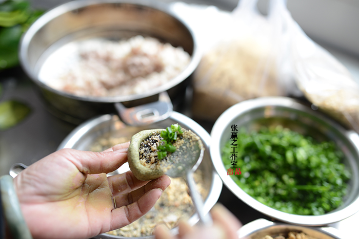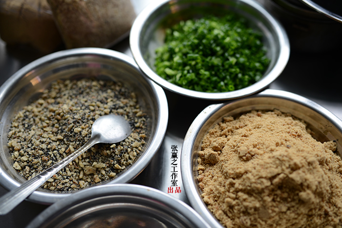 先来看看原料。传统的温州棉菜饼分甜、咸两种口味。甜馅儿的原料为红糖、核桃花生芝麻碎、葱花和肥肉。咸馅儿的则是豆腐干、笋、肉等。各乡镇可能也存在细微差异。本次只做了甜的。