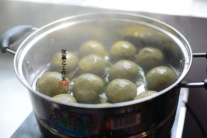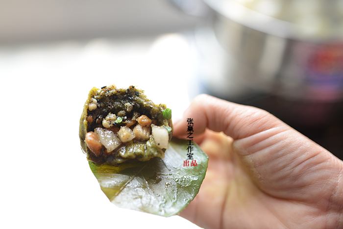 团成扁圆形。上下相反,将放肥肉的这册贴上柚子叶。完成。
