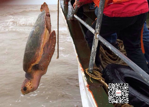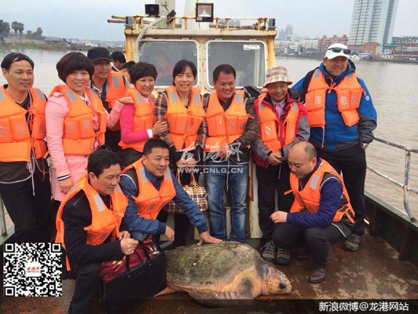 上午10点,苍南县东海民防救援中心派出一艘快艇停在东海码头,4名义工将大海龟抬至甲板上,10名义工一起随艇出海护送。由于今天风大浪高,经过1个小时的颠簸航行至舥艚外深水海域时,4名义工将大海龟再次抬起放入大海中,转眼间大海龟就不见了踪影。